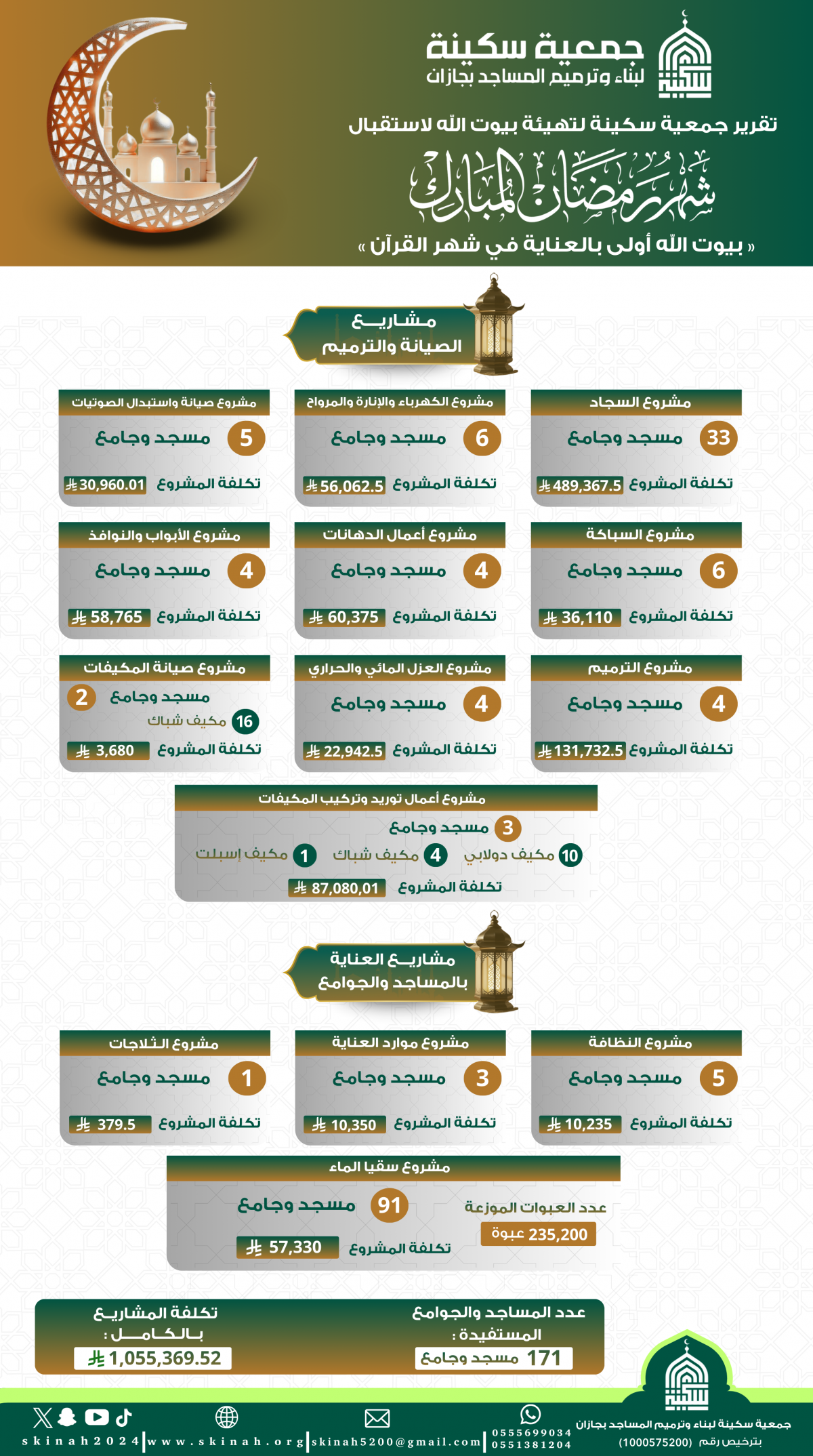 هيّأت جمعية سكينة لبناء وترميم المساجد بجازان (171) مسجدًا وجامعًا بمختلف محافظات المنطقة استعدادًا لرمضان عبر الصيانة والترميم والتجهيز (سجاد، كهرباء، سباكة، تكييف، نظافة، وسقيا ماء).