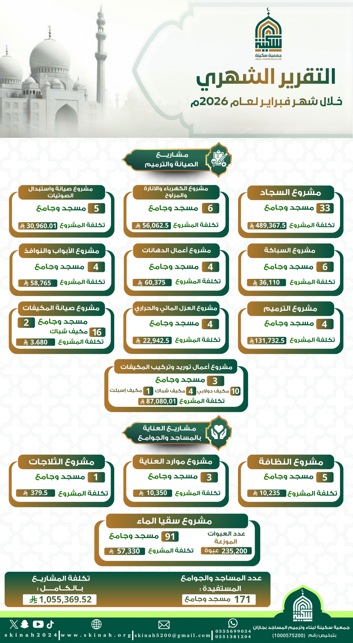 نفذت جمعية سكينة خلال فبراير 2026م أعمال صيانة وترميم لـ 171 مسجدًا وجامعًا بمنطقة جازان بتكلفة تجاوزت 1,055,369 ريال وشملت المشاريع: السجاد، الترميم، الكهرباء، السباكة، التكييف، النظافة، وسقيا الماء، مع توزيع 235,200 عبوة ماء لخدمة بيوت الله والمصلين.